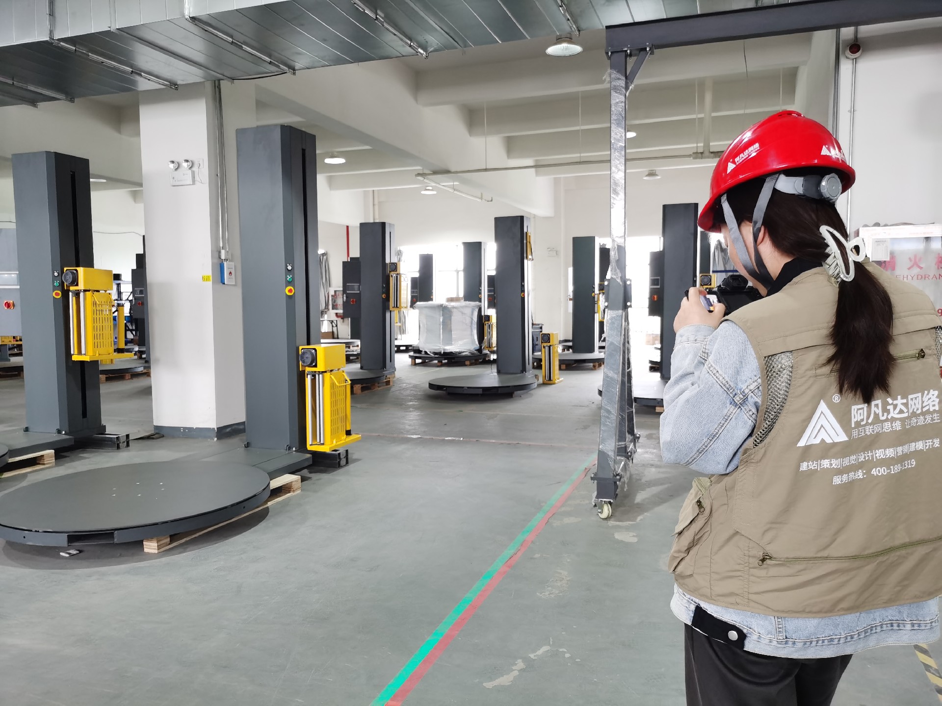 午后,拍攝進(jìn)入動(dòng)態(tài)演示階段。小黃蜂的接待人員安排了一位工人師傅開啟了一臺(tái)智能纏繞機(jī)進(jìn)行了自動(dòng)打包過程的演示。攝影師采用鏡頭記錄了設(shè)備運(yùn)轉(zhuǎn)細(xì)節(jié)。與此同時(shí),攝影助理讓無人機(jī)在園區(qū)外升空,從空中視角記錄標(biāo)準(zhǔn)化廠房的建筑美學(xué)——整齊排布的太陽能板、清晰的物流動(dòng)線、規(guī)整的停車區(qū)域,共同構(gòu)建起現(xiàn)代化制造企業(yè)的視覺圖譜。